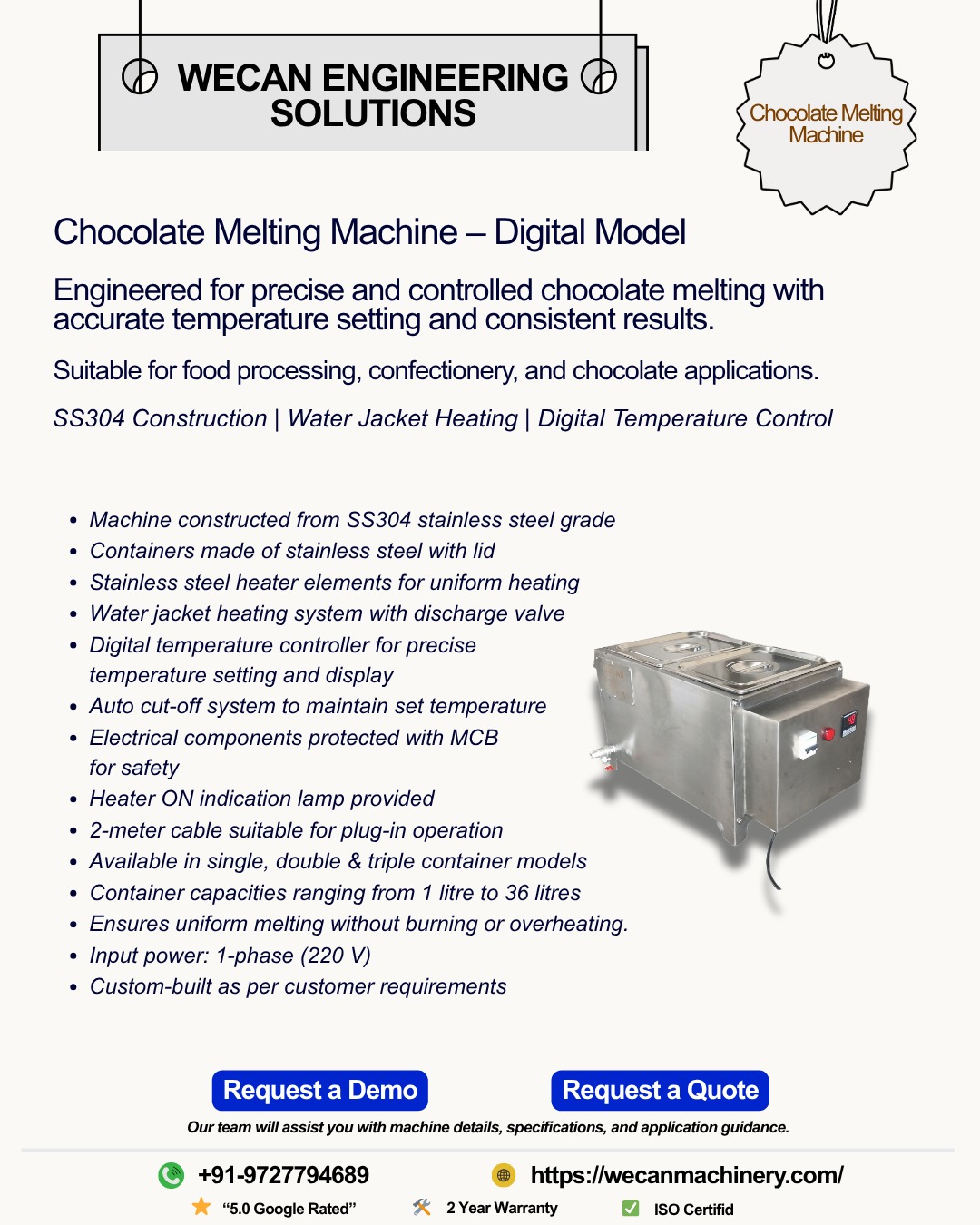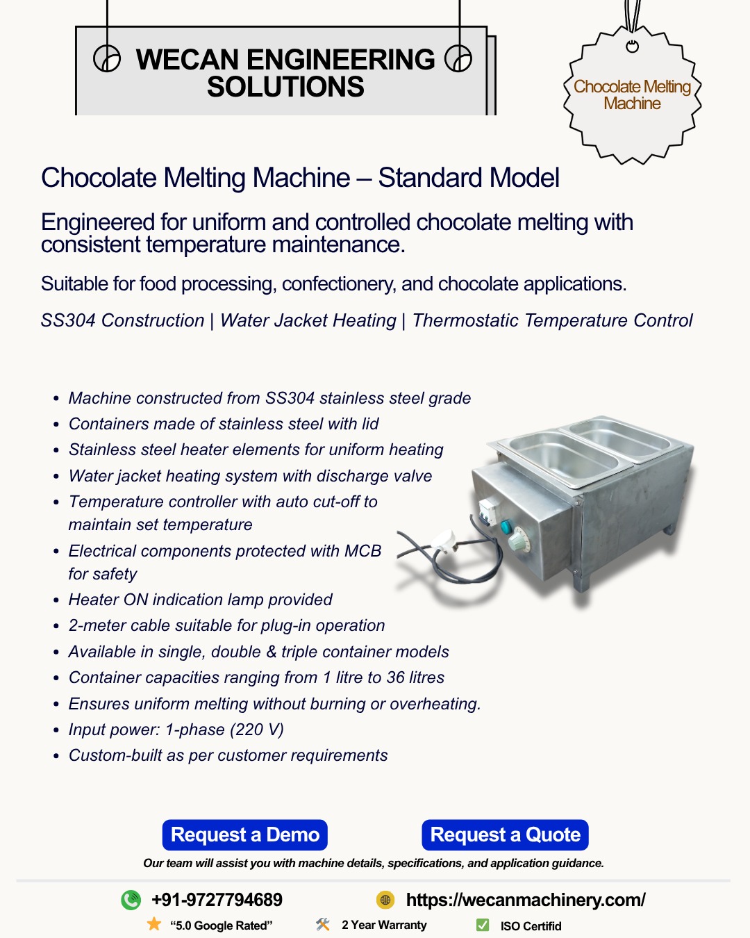 CHOCOLATE MELTING MACHINE FOR FOOD & CONFECTIONERY INDUSTRY